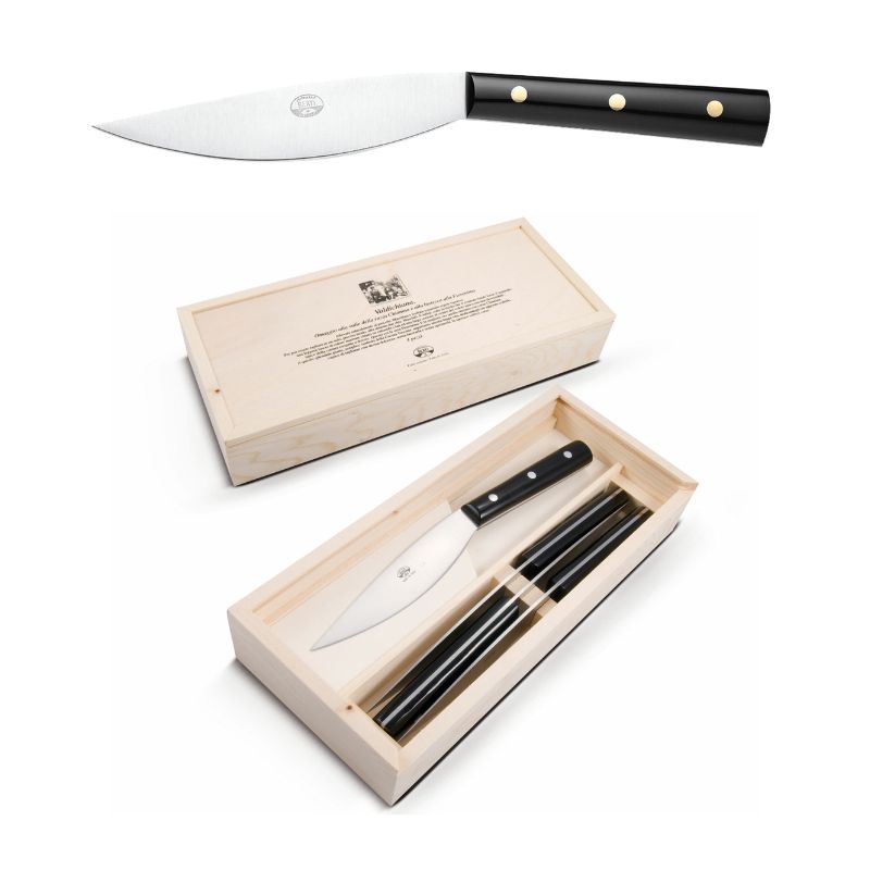 Ogni set è confezionato in una preziosa scatola di legno contenente 4 coltelli da tavola, ideale anche come regalo di pregio.
